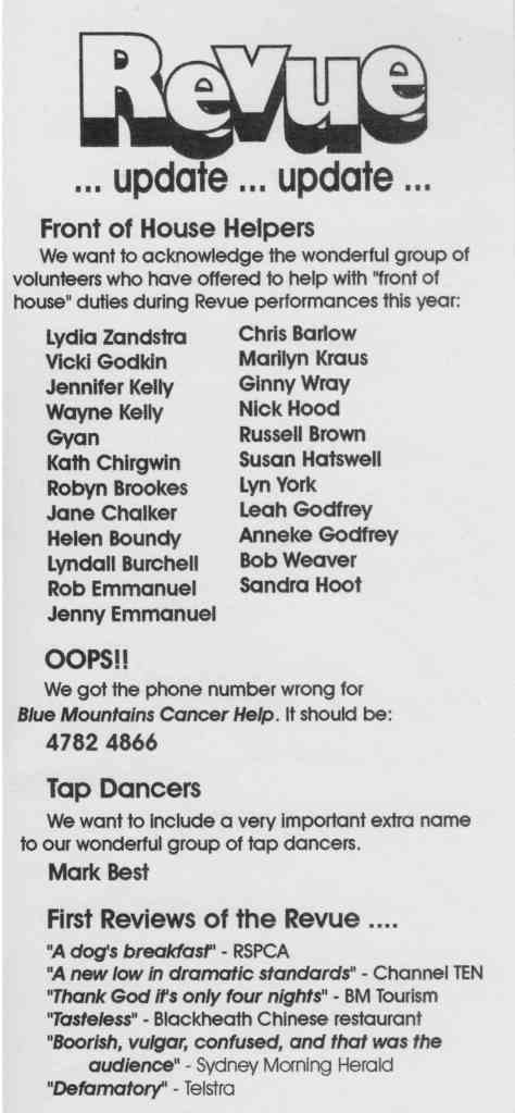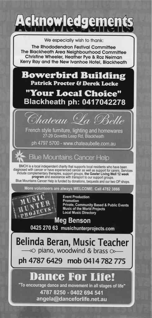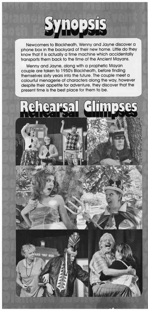 New residents in 2012 accidentally get transported back and forth through time in the Last Phone box in Blackheath. Ancient Mayans (and calendar predicting end of the world in 2012), the first Rhodo festival, Blackheath in 2072, after global warming flooding. Includes Action Group sketches, OH&S inspectors, T-BAGs, the 60th anniversary of Rhodo festival. (Click on an image to view a larger version.)