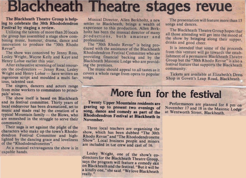 The Rhodo Revue is unashamedly Blackheath-centric. A main event of the month-long Rhododendron Festival celebrations in November, it always has an underlying theme of “being glad about who we are and where we live”, with original scripts and song lyrics, comedy and lots of local current affairs. It attracts audiences from all over the mountains, Sydney and even further afield. As one fan from Canberra remarked: “I love this kind of thing and yours are the best.”