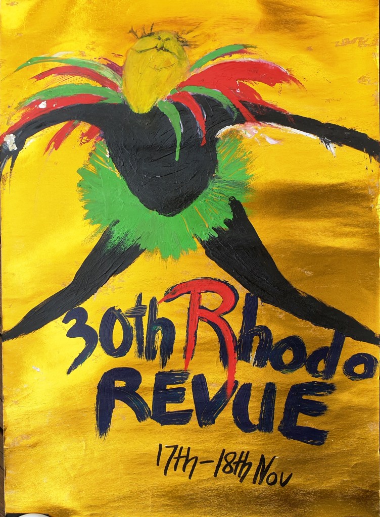The 30th Rhodo Revue, the first revue in 1982, was instigated by locals Jenny Ross and Wayne Kelly (and a few of their friends who have since moved away) and was centred around a reluctant Rhododendron Queen. Despite the title, it was actually the 29th Rhododendron Festival! The poster for the revue was painted by Kate Lohse: